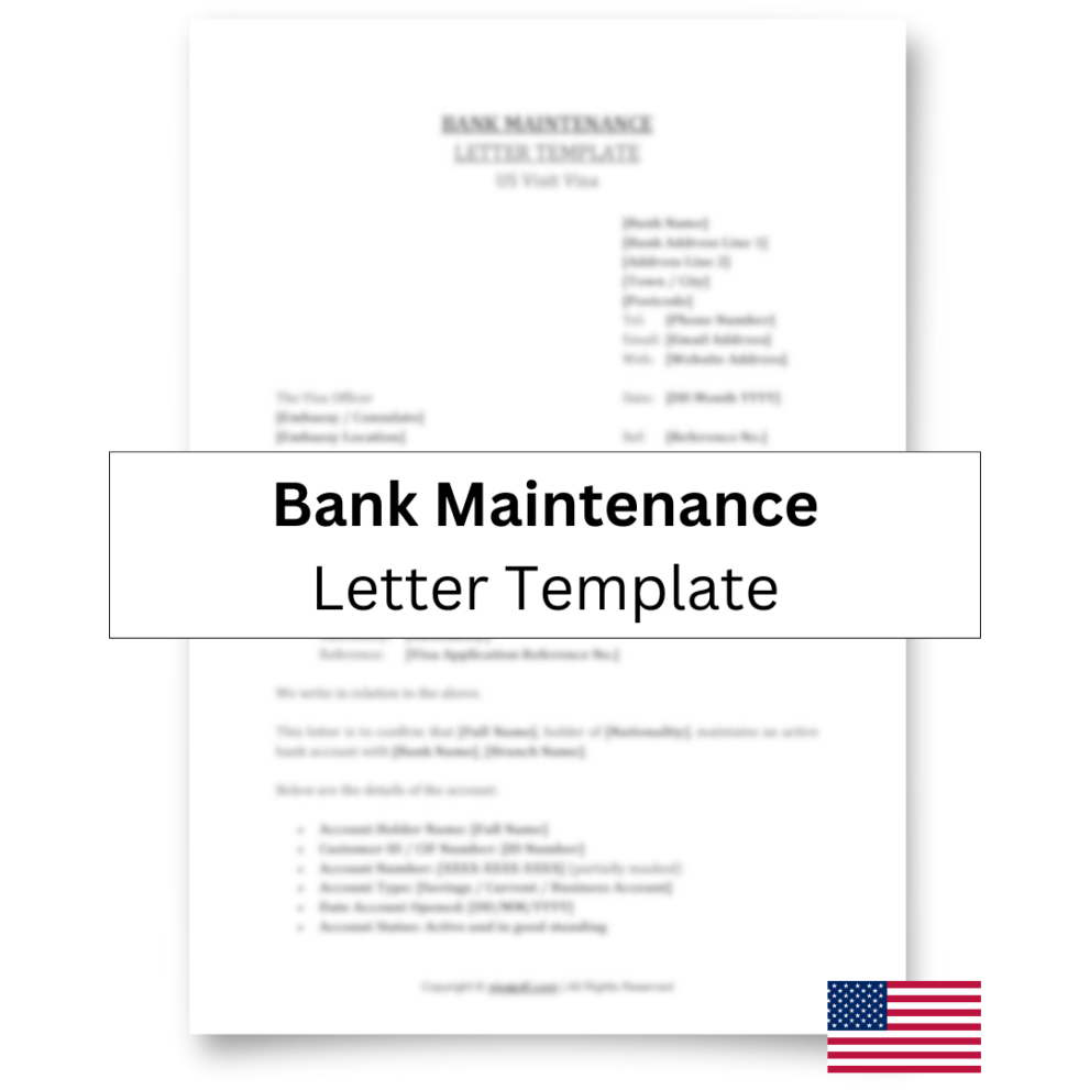 The Bank Maintenance Letter Template (US Visit Visa) is a professionally drafted document designed to help applicants present clear, credible, and well-structured proof of funds for a US Visit (B-1/B-2) Visa application. A bank maintenance letter confirms that an applicant has maintained a stable bank balance over a specific period, which is a key factor assessed by US consular officers when reviewing financial capability and overall credibility.