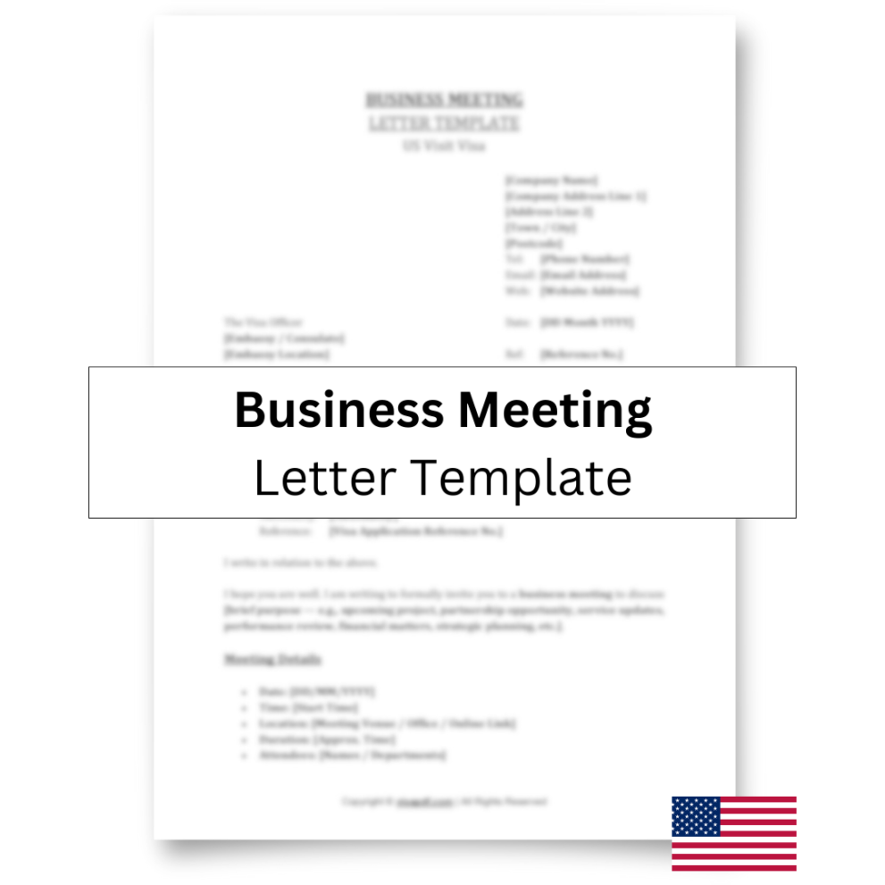 Download the Business Meeting Letter Template (US Visit Visa) today and present your US business meeting arrangements clearly, professionally, and with confidence.